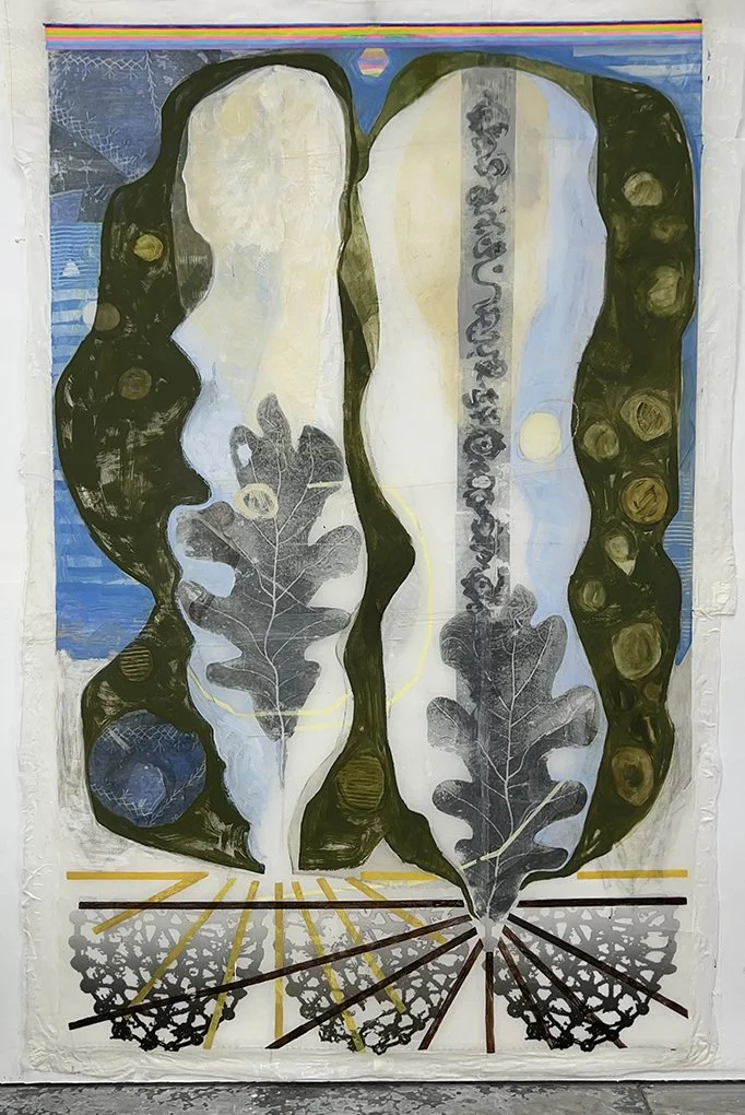 Forest Walker acrylic, ink, fabric, mylar 102x66.5 inches first shown at Woodstock Art Museum Jan, 2026